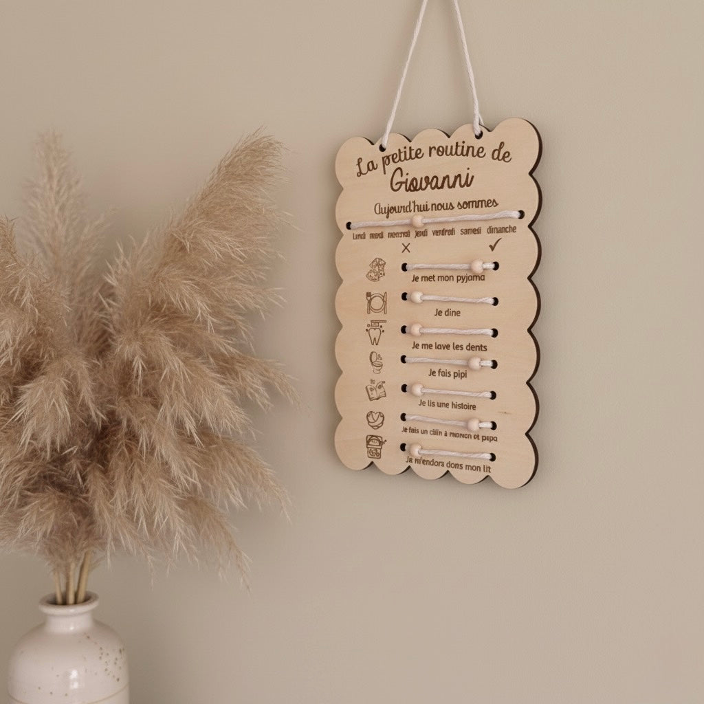 Cette plaque en bois personnalisée accompagne les petits dans les gestes du quotidien : se brosser les dents, ranger ses jouets, s’habiller, etc.